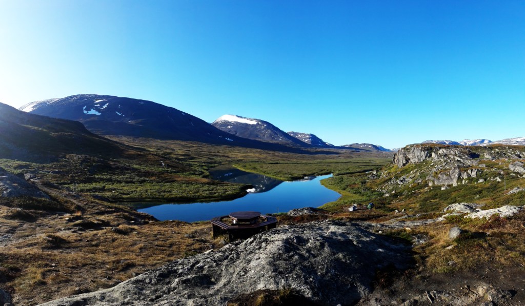 2. Abiskojaure – Alesjaure (21km): Nach der Absikojaure Hütte steigt der Weg an und führt über die Baumgrenze. Es dominieren die weiten Blicke auf die umliegenden Berge. Vor allem der zweite Teil der Strecke verschlägt den Atem mit dem Blick auf die weite Seenlandschaft. Vielleicht ist dies wegen der Länge und den Höhenmetern die anstrengendste Etappe. Am Ende wartet einer der schönsten Ausblicke des ganzen Weges auf das Tal des Aliseatnu-Fluss.