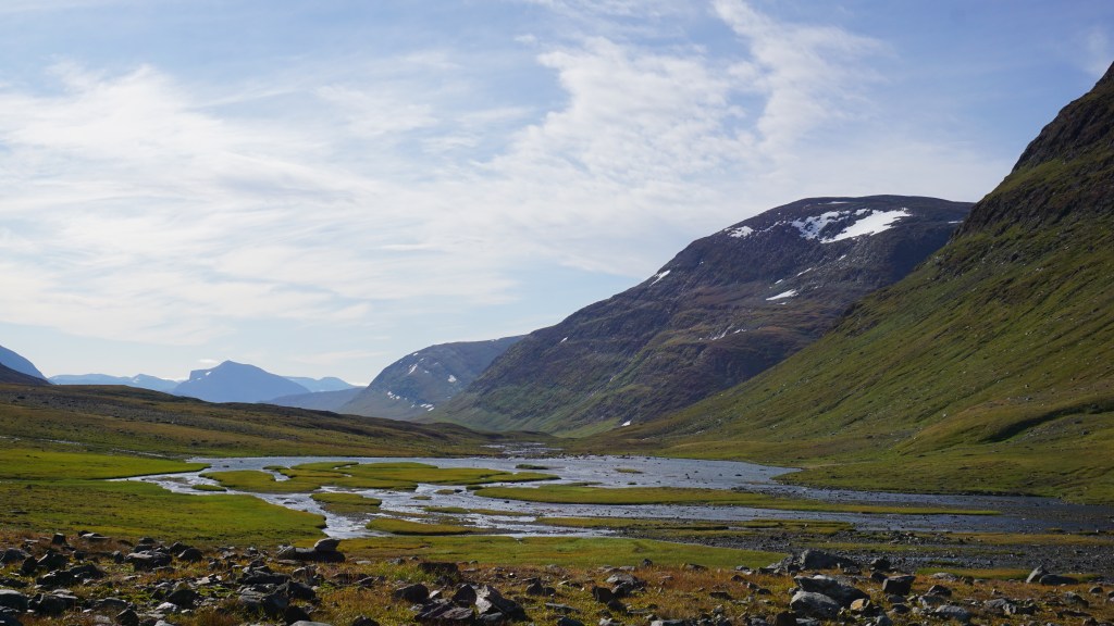 5. Sälka – Singi (12km): Die Sälka Hütte liegt wie eine natürliche Warft in der Mitte des weiten Tals und ist für mich der Inbegriff der vielen, schön gelegenen Hütten des Kungsleden. Die ganze Tagestour folgt dem Tal und dem Flusslauf. Bei schönem Wetter möchte man jede Stunde Pause machen, um die Blicke in die Nebentäler und auf die höchsten Berge Schwedens zu genießen.