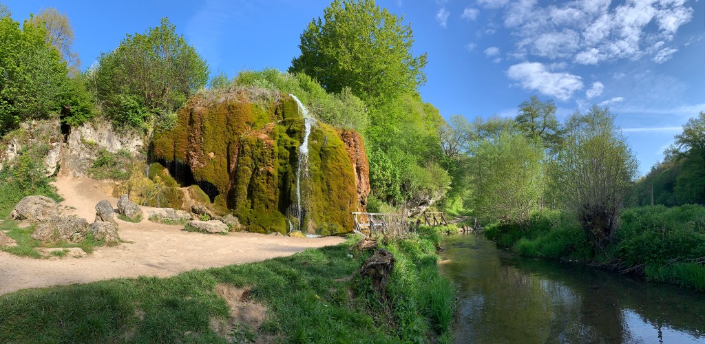 Wasserfall Dreimühlen (Etappe 8): ... liegt unscheinbar in einem kleinen Tal. Er wächst durch Kalkablagerungen immer weiter und ist ein interessantes Gebilde.