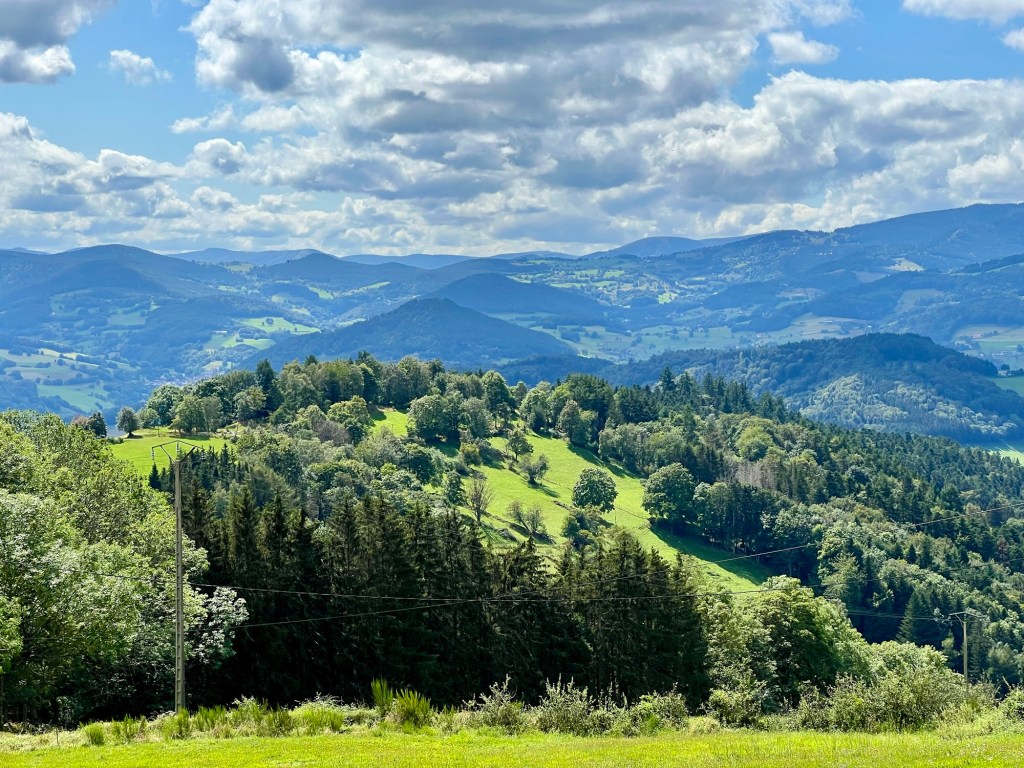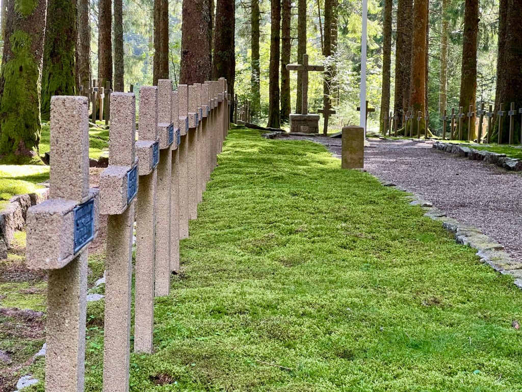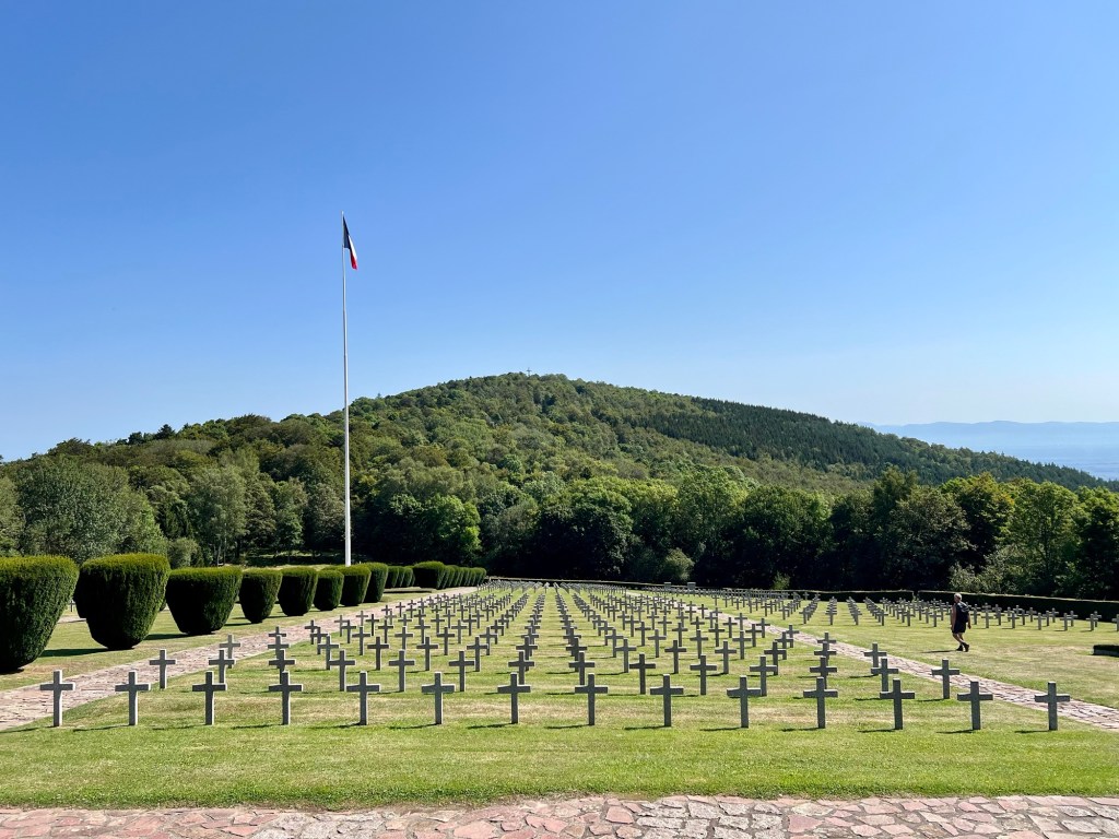 Heute beginn eine ca. viertägige Tour über die höchsten Berge der Vogesen, die auf einem Kamm liegen. Im ersten Weltkrieg war dies teilweise Frontverlauf, so dass mich Gedenkstätten, Bunker und ein Soldatenfriedhof erwarten. Stets begleitet und erschließt den Weg eine Kammstraße, mit der damals die Front versorgt wurde. Anfangs geht es wieder ordentlich bergauf, bis ich vom Tal (250m) bis auf über 1000m-Höhe bin. Dann sind die Gipfel aber gut zu bewältigen. Die Landschaft der Hochvogesen ist durch Fernblicke, Wälder, Wiesen und Weiden geprägt. Im Winter sind dies teilweise Skigebiete. Alle paar Stunden kommt man durch kleine Orte oder quert Straßen.