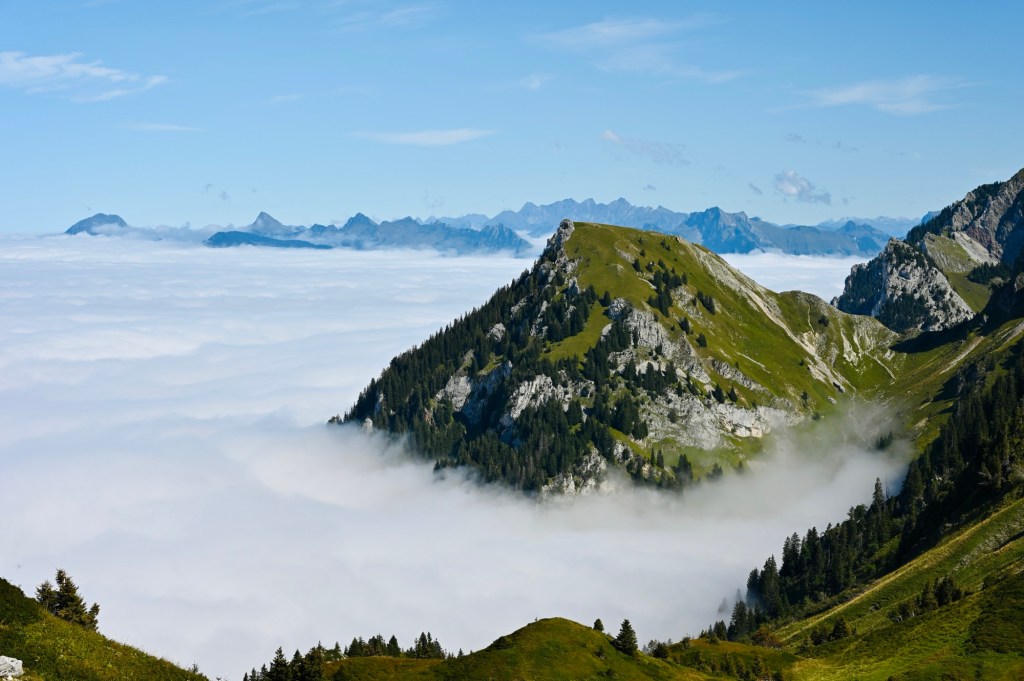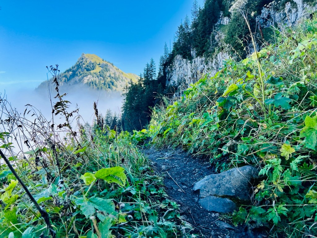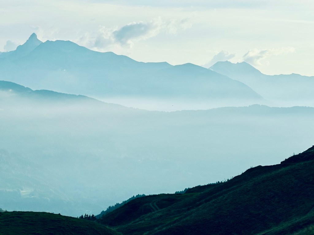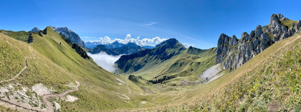 Beim langen Aufstieg, der mich durch die Wolkendecke von 374m (Saint-Gingolph) auf 1916m (Col des Bise) führt, fluche ich, weil jeder Meter bergauf anstrengend ist. „Nix mit >gut eingelaufen<“ denke ich noch. Und dann kommt der immer wieder magische Moment, wenn ich einen Pass erreiche: der plötzliche Blick auf die Weite des nächsten Tals. Beim zweiten Pass des Tages, dem Pass de la Bosse, geht mir das Herz auf. Dazwischen liegt das liebliche und fast baumfreie Bise-Tal mit erholsamer Gastronomie und steilen Gipfeln ringsum. Am Ende des Tages bin ich, rechne ich die Auf- und Abstiege zusammen, unglaubliche 3.100 Höhenmeter gelaufen – eine Strecke, die ich noch nie – auch nur im Ansatz – bewältigt habe. Offensichtlich gibt es also doch einen GR 5-Trainingseffekt. Und plötzlich verstehe ich, wieso es ab Thonon-les-Bains einen alternativen, zweitägigen Einstieg in den GR 5/GTA gibt.