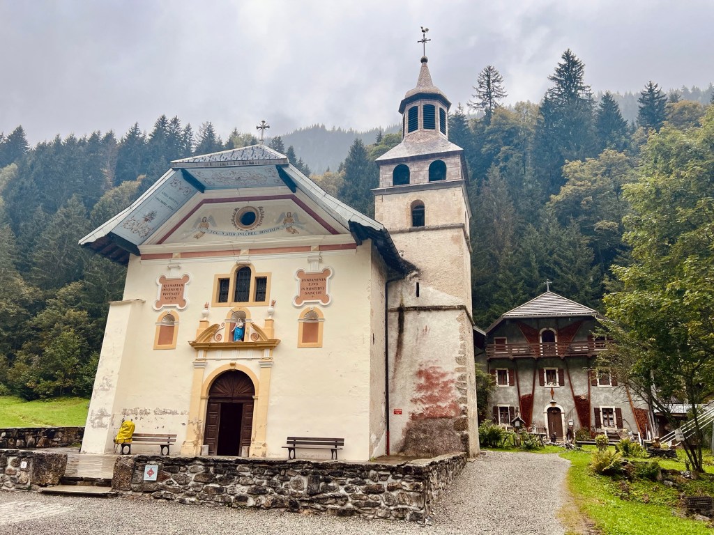 Eine angenehme Wanderung führt mich heute von Les Houches (wo ich per Zug von Chamonix auf den Trail zurückkehre) zunächst auf einer Skipiste (dem langweiligsten Abschnitt des Tages) hinauf zum Pass Col de Voza. Leider ist es heute wolkenverhangen mit gelegentlichen Schauern. So fällt der Panoramablick auf den Mont Blanc aus. Den Rest des Tages steigt der GR 5 erst in das Tal ab, um dann entlang des Fluss Bon Nant zum Talanfang relativ eben zu verlaufen.