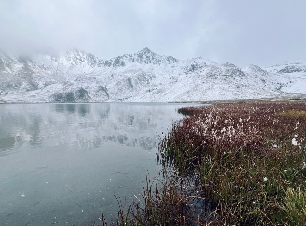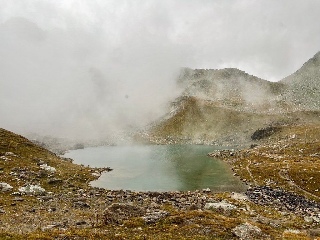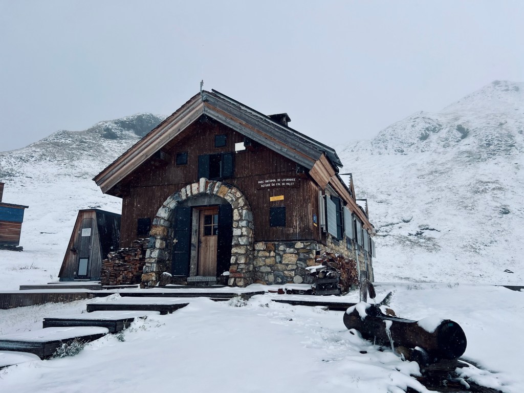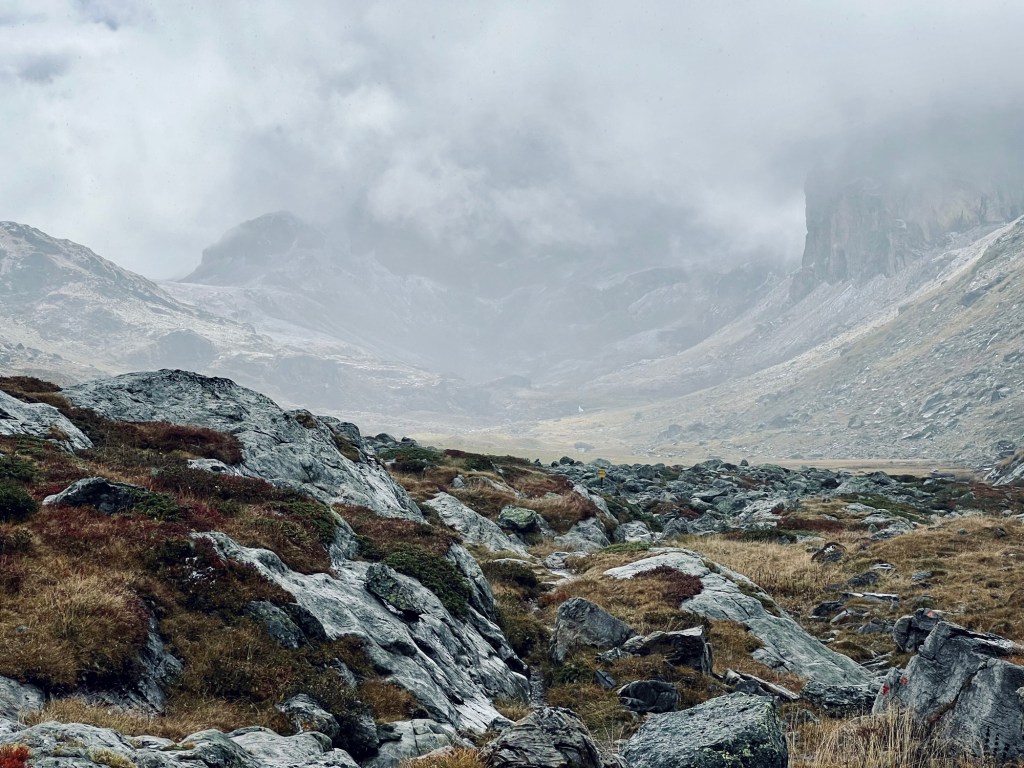 Ein Nationalpark für mich alleine! Ich treffe niemand; kein Wunder, denn das Wetter im NP Vanoise ist bescheiden: auf 1700m steige ich in die Wolken/Nebel, auf 2200m fallen erste Schneeflocken, das Refuge du Col du Palet (2581m, kurz unter dem gleichnamigen Pass) ist tief eingeschneit. Alleine verbringe ich Nachmittag und Nacht; gemütlich, nachdem der Ofen (mit feuchtem Holz) endlich läuft. Die wahre Schönheit des Parc National de la Vanoise lässt sich erahnen, wenn die Wolken aufreißen – sie muss erfurchtgebietend sein. Doch auch in Nebel und Schnee entsteht ein Zauber.
