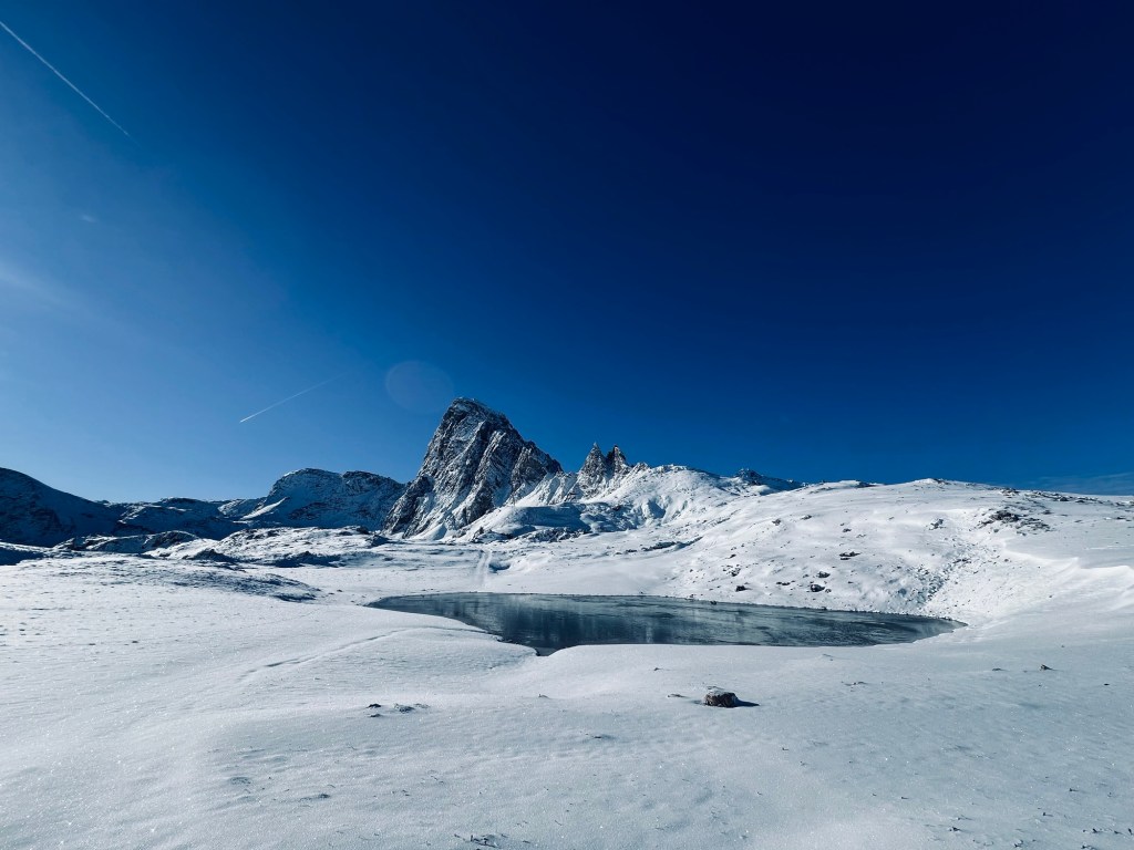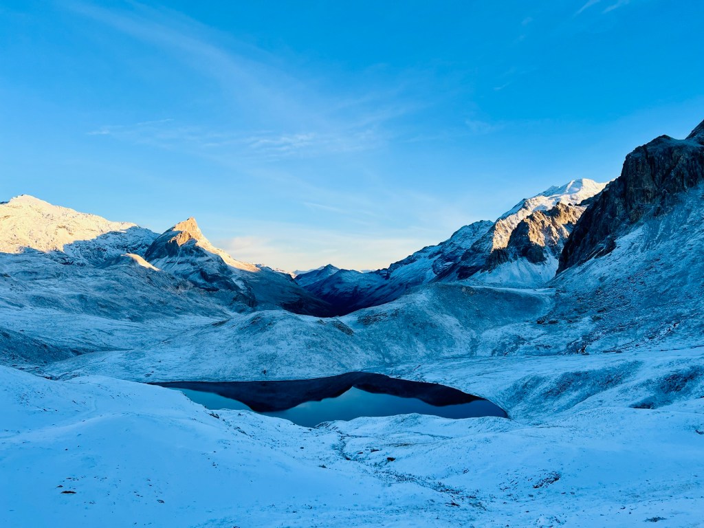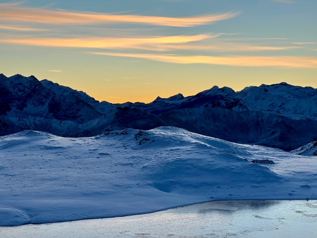 Ich kann mein Glück kaum fassen, als mich morgens ein Winter-Wonderland mit wolkenlosen Himmel begrüßt. Durch ca 10 cm Schnee wandere ich die letzten Meter zum Col du Palet (2652m) und durchs menschenleere Skigebiet ins Tal des schönen Lac de Tignes mit den hässlichen Ortsteilen von Tignes. Über den Pas de la Tovière gelange ich nach Val‘d Isère, den bekanntesten Wintersportort der Region. Alle Orte sind in der Zwischensaison trostlose und ausgestorbene Bettenburgen mit nur wenig Infrastruktur, wohl ganz anders als im Winter und Sommer. Vor mir liegen anstrengende Tage, so dass ich die Tour heute kurz halte und unzählige Fotos mache.