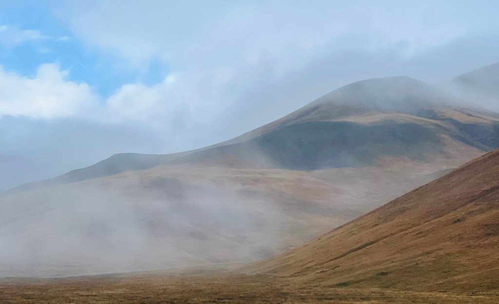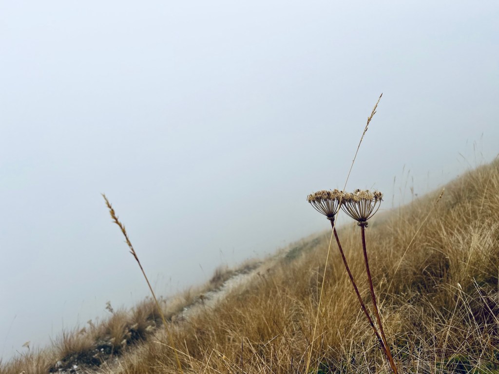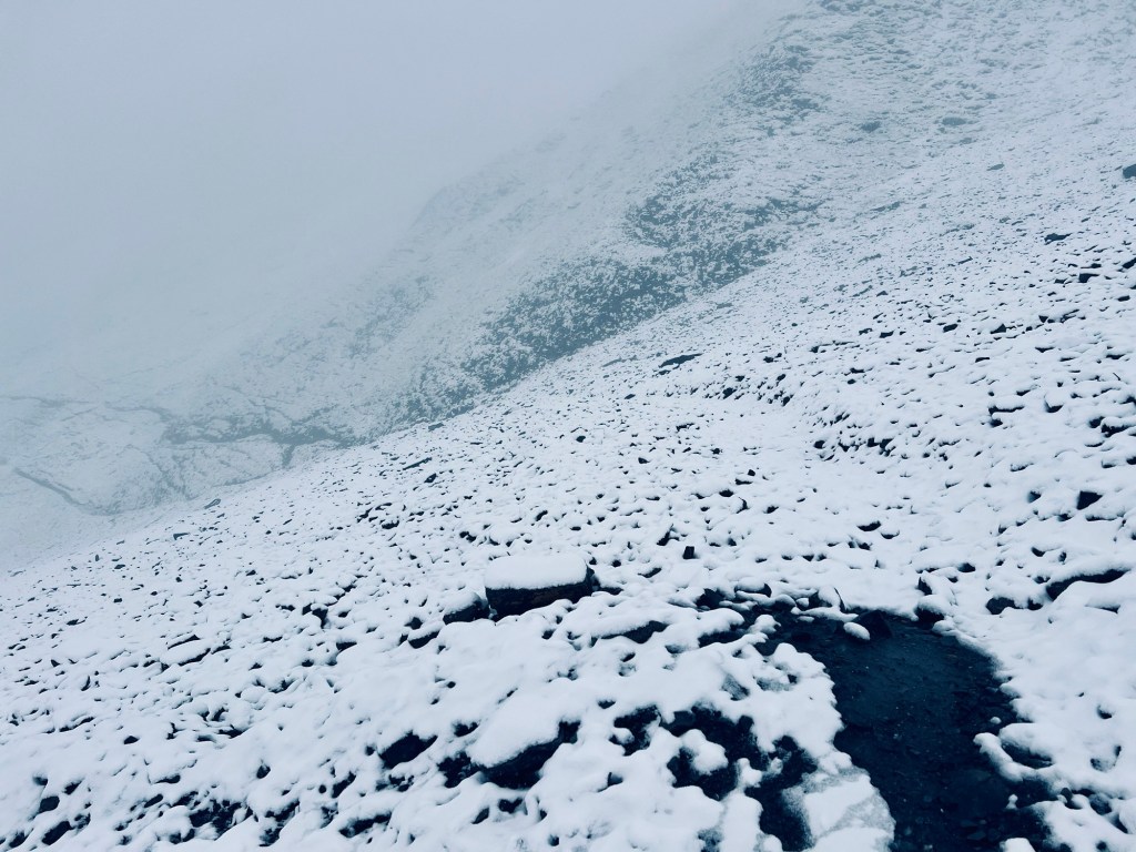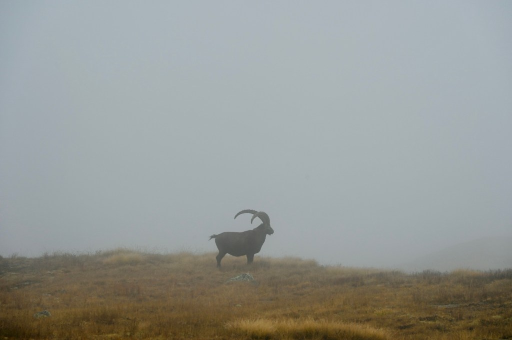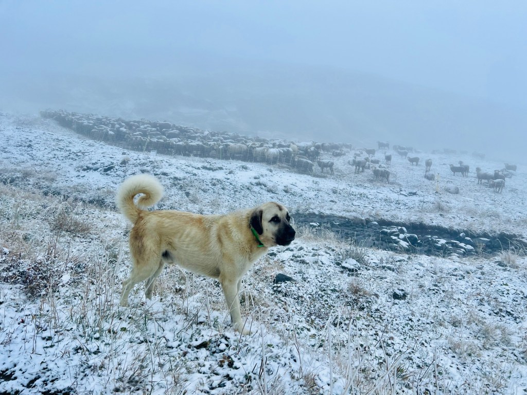 Schneefall und Nebel halten an. Die Sicht liegt bei max 100 Metern und manchmal ist der Weg nicht mehr zu sehen. Das Wandern in einer Höhe von 2000-2500m hat auch bei Schnee und Nebel eine gewisse Romantik. Dennoch entschließe ich mich nach einem halben Tag zu einem früheren Abstieg und gegen eine weitere Nacht in dieser undurchsichtigen Suppe. Zweimal begegne ich heute freilaufenden Hunden, die mich anknurren und begleiten, um ihre Schafherden zu beschützen – angeblich nicht ungefährlich für Wanderer:innen.