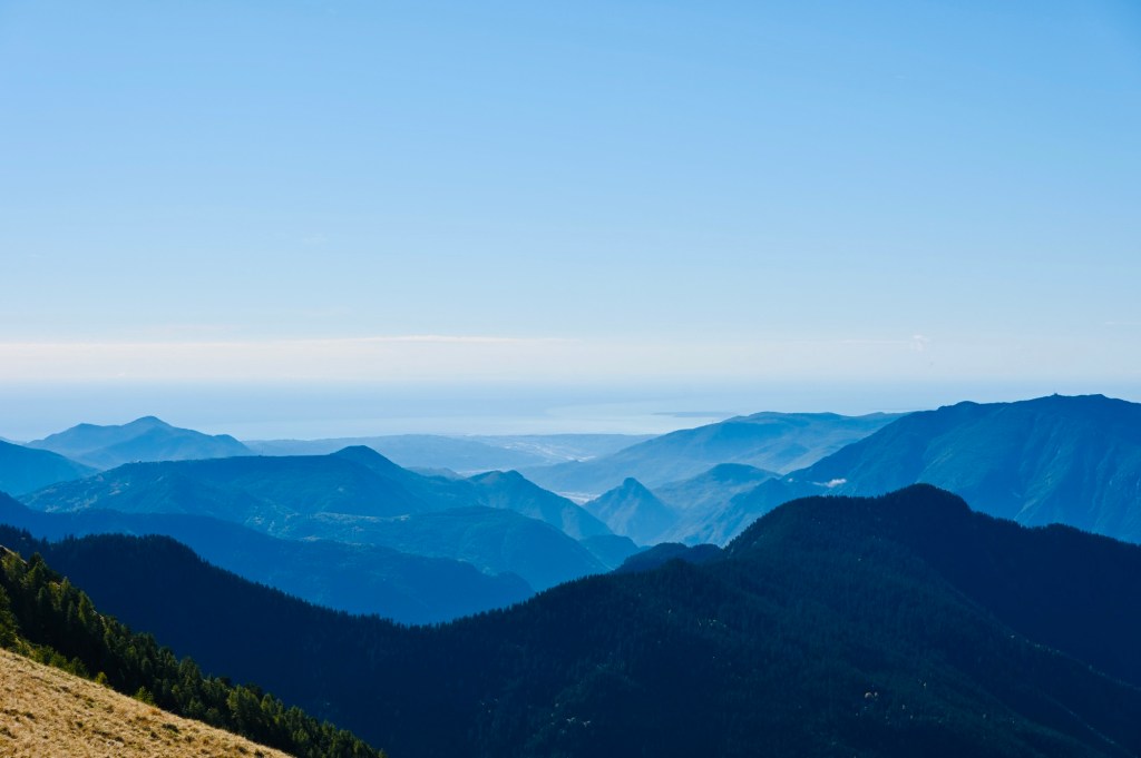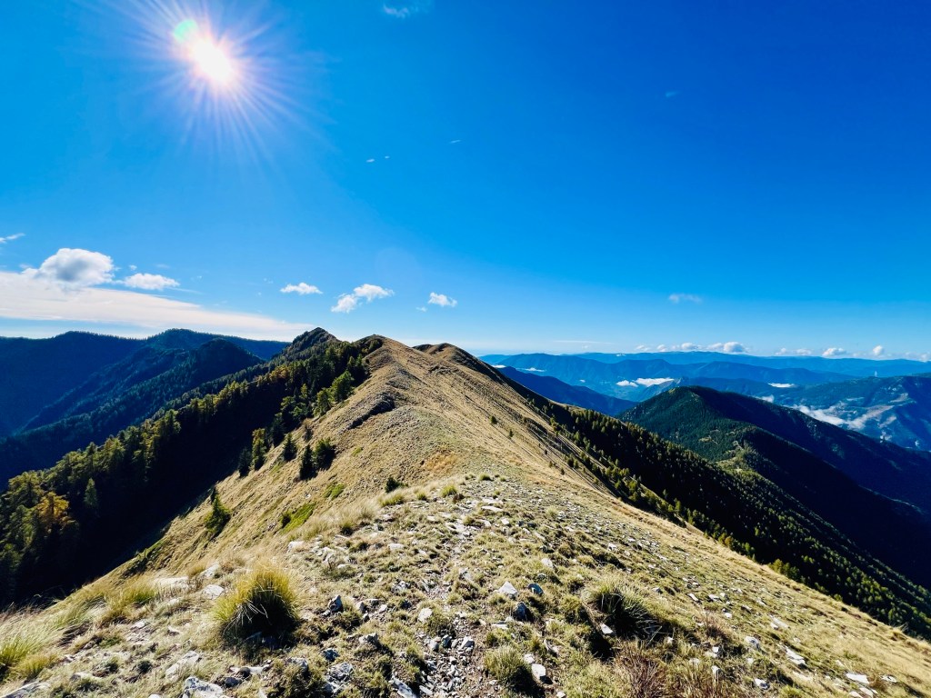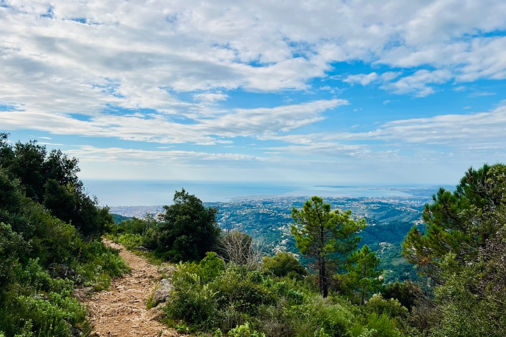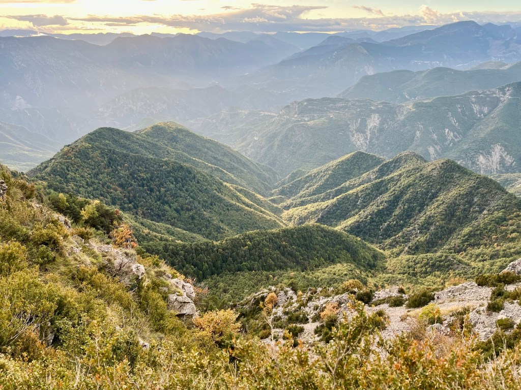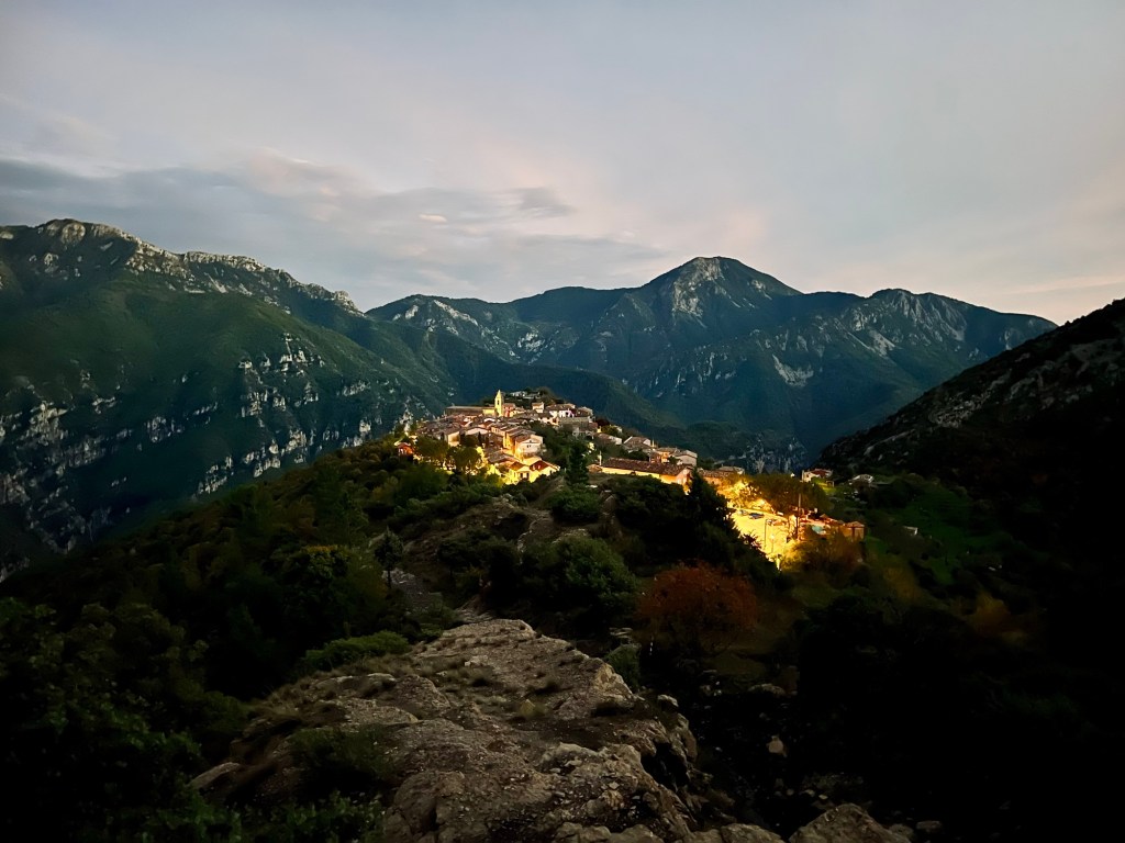 Am drittletzten Tag begrüßt mich die Sonne, als ich zum letzten Mal auf über 2000m Höhe steige. Und um 11h kann ich vom Gipfel des La Caïre Gros (2087m) zum ersten Mal das Mittelmeer und Nizza sehen – ein erhebendes Gefühl. Den Rest des Tages wandere ich ziemlich weit oben entlang eines Höhenzuges, der erstaunlich steil ist und tolle Ausblicke auf die umliegenden Gipfel, Täler und Dörfer bietet – eine richtige Hochgebirgstour. Utelle, der Zielort heute, ist wieder so ein traumhaft Ort, der wie ein Adlernest auf einer Bergkuppe liegt.