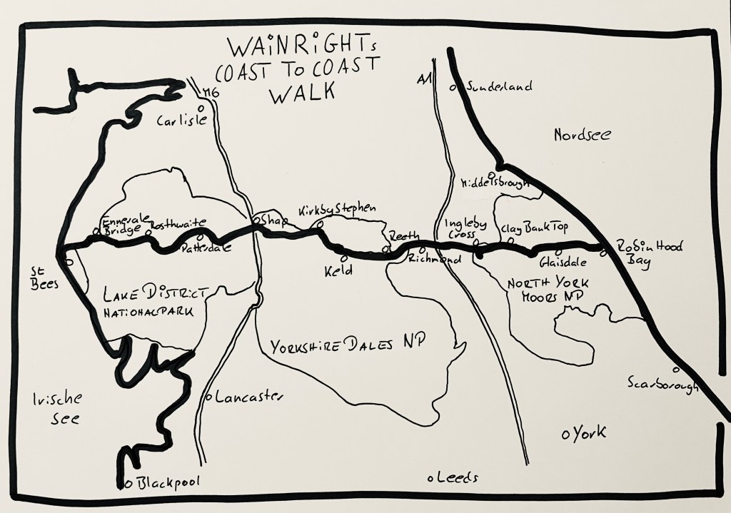 Alfred Wainright, ein legendärer englischer Reiseautor, hat in den 1950er und 1960er Jahren diesen Küste zu Küste-Wanderweg entwickelt und 1973 als Buch veröffentlicht. Erst seit 2022 ist der beliebteste Wanderweg Großbritanniens ein offizieller National Trail und durchgehend ausgeschildert. Er startet an der Irischen See in St. Bees und endet an der Nordsee an der Robin Hoods Bay. Dazwischen führt er durch die drei so unterschiedlichen wie wundervollen Nationalparks Lake District, Yorkshire Dales und North York Moors.