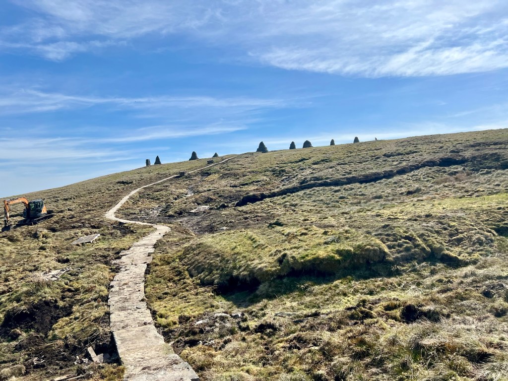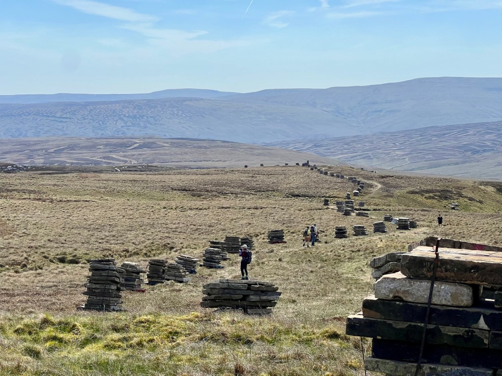 Heute geht es über den letzten großen Gipfel der Wanderung, den Nine Standards Rigg (662m). Aufstieg und Abstieg sind nicht steil und angenehm. Aktuell wird der Weg neu mit Platten ausgelegt. Denn für den Weg über die Höhen und das Moor gibt es je nach Jahreszeit und Wetter drei Varianten. Wieder habe ich bei dem fantastischen Wetter (ca 21 Grad und Sonne) einen Fernblick, ohne einen Baum oder Hof zu sehen. Die gibt es aber in den Tälern. In Keld, dem süßen kleinen Zielort der Etappe, ist die Hälfte der Strecke gewandert. Gerade heute entstehen viele Gespräche mit anderen Wanderern. Kurz: ein perfekter Tag.